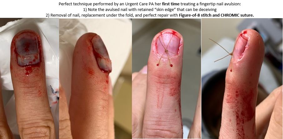 Use a chromic suture passed first through the tip of the finger then passed through the skin proximal to the nail fold. This forms a “figure 8” stitch that is tied down over the nail. It holds the nail in place and avoids having to force a needle through the nail plate.